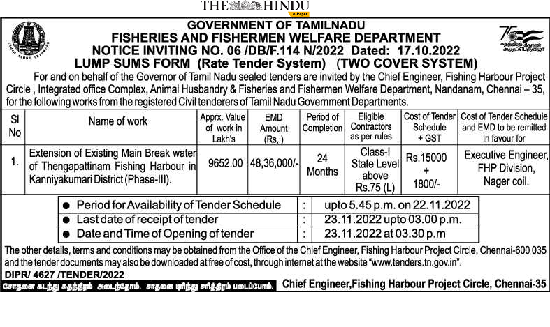 Extension of Existing Main Break Water of Thengapattinam Fishing Harbor in Kanniyakumari District (Phase-III).