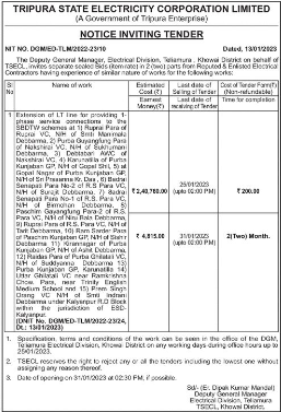 Tender for Extension of LT line for providing 1-phase connections the BEDTW schemes at 11 Rupra Para of Rupra VC, NH of Beti Monimda of Naksha VC. 3) Dentaban AC of Nassical VC 4) Canal of Pur KGP, NH of Gopal Shi, 5) Gopal Nagar of Pubs Kunjatan GP