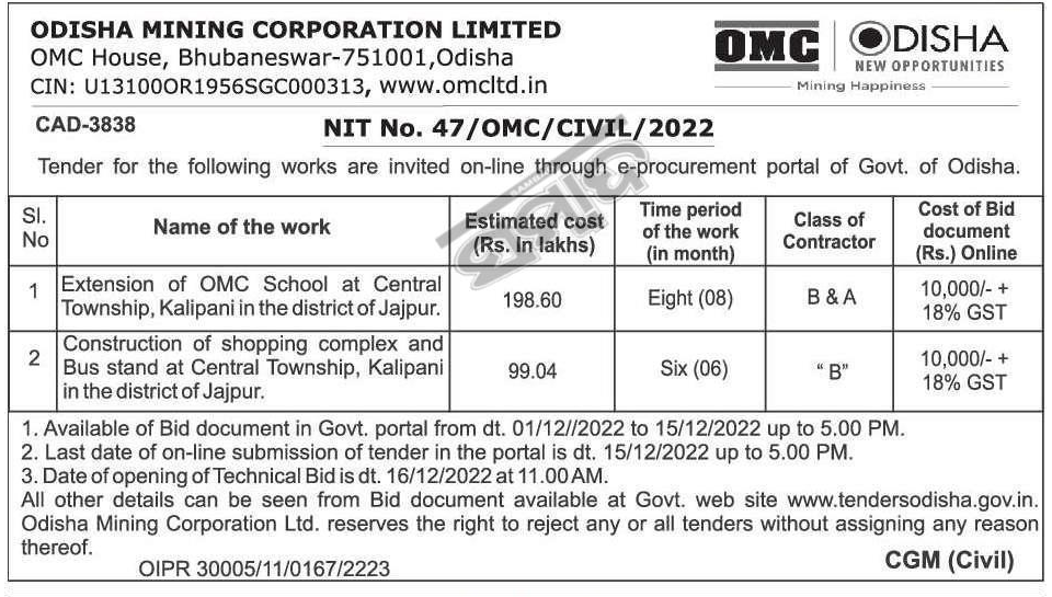 Tender for Extension of OMC School at Central Township, Kalipani in the district of Jajpur.