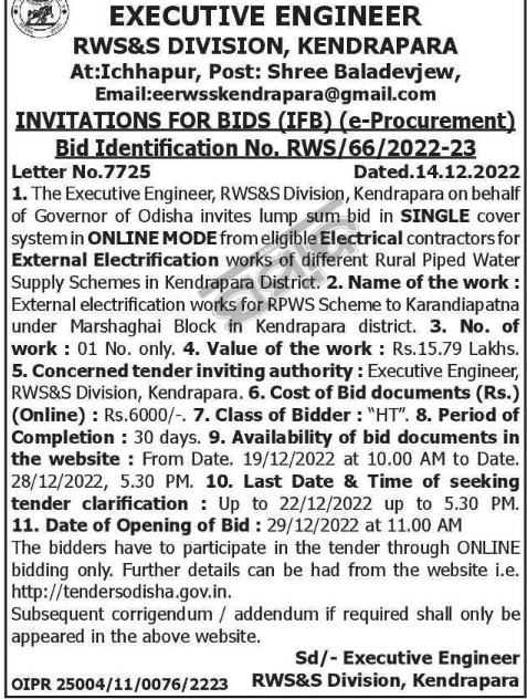 Tender for External electrification works for RPWS Scheme to Karandiapatna under Marshaghai Block in Kendrapara district. 3. No. of work: 01 No. only. 4. Value of the work