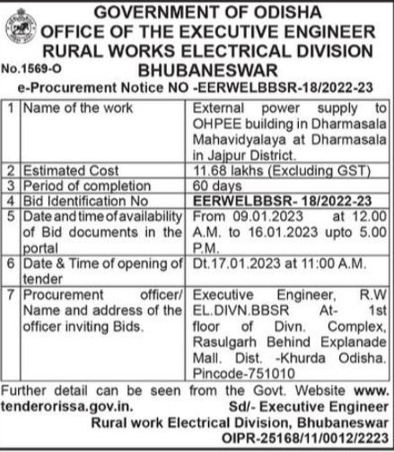 Tender for External power supply to OHPEE building in Dharmasala Mahavidyalaya at Dharmasala in Jajpur District.