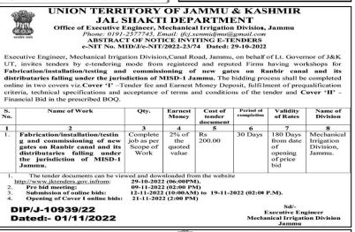 Tender for Fabrication/installation/testin and commissioning of new gates on Ranbir canal and its distributaries falling under the jurisdiction of MISD-1