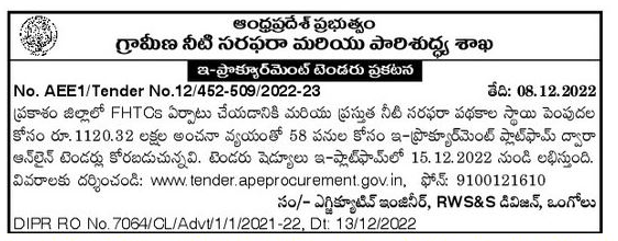 Tender for FHTOS in Prakasam district and upgradation of existing water supply schemes