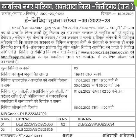 Tender for Finance Commission/Sixth State Finance Commission/Private Income Tax by Nagar Palika Rawatbhata for the following works and the listed contractors/swedars of appropriate class of Rajasthan