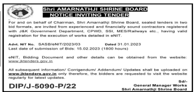 Tender for financially sound contractors registered with J&K Government Department, CPWD, SSI, MES/Railways et