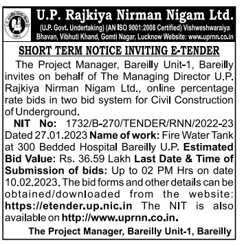 Tender for Fire Water Tank at 300 Bedded Hospital Bareilly U.P.