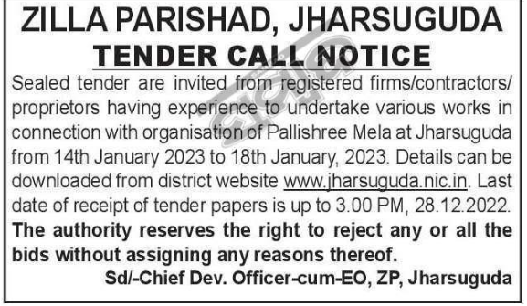 Tender for firms/contractors/ proprietors having experience to undertake various works in connection with organisation of Pallishree Mela at Jharsuguda from 14th January 2023 to 18th January, 2023