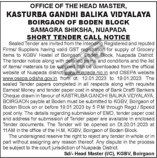 Tender for Firms/ Suppliers having valid GST registration for supply of Grocery items to KGBV Hostel of Boirgaon, Boden Block, Nuapada District