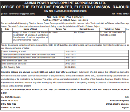 Fixing of Rate Contract for Repair/ Reclamation of Damaged Distribution Transformers of various capacities at Divisional Workshop Rajouri.
