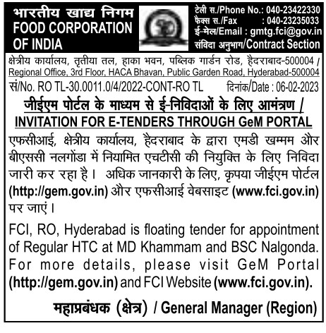 TENDER FOR APPOINTMENT OF REGULAR HTC AT MD KHAMMAM