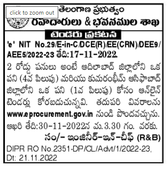 for 2 road works i.e. one work in Adilabad district (4th call) and one work in Kumarambhim Asifabad district