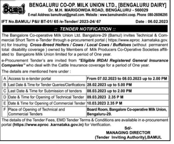 The Bangalore Co-operative Milk Union Ltd. Bangalore-29 (Bamul) invites Technical & Com- mercial Short Term e-Tender through e-procurement portal (https://www.eproc.kamataka.gov. in) for Insuring Cross-Breed Heifers/Cows/Local Cows/Buffaloes (without permanent total disability coverage) owned by Members of Milk Producers Co-Operative Societies affili- ated to Bangalore Milk Union limited for a period of One year.
