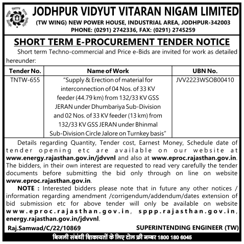 “Supply & Erection of material for interconnection of 04 Nos. of 33 KV feeder (44.79 km) from 132/33 KV GSS JERAN under Dhumbariya Sub-Division and 02 Nos. of 33 KV feeder (13 km) from 132/33 KV GSS JERAN under Bhinmal Sub-Division Circle Jalore on Turnkey basis”