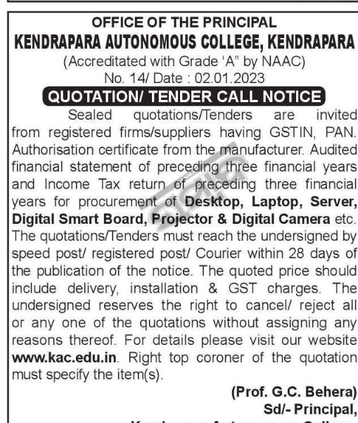 Tender for for procurement of Desktop, Laptop, Server, Digital Smart Board, Projector & Digital Camera etc. The quotations/Tenders must reach the undersigned by speed post/ registered post/ Courier within 28 days of the publication of the notice