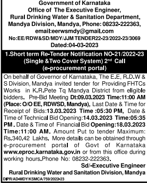 Tender for for Providing FHTCs Works in K.R.Pete Tq Mandya District from eligible bidders. Pre-Bid Meeting Dt:09.03.2023 Time:11:00 AM (Place: O/O EE, RDWSD, Mandya),