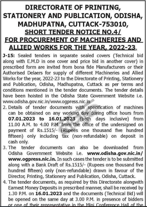 Tender for for supply of different Machineries and Allied Works for the year, 2022-23 to the Directorate of Printing, Stationery and Publication, Odisha, Madhupatna