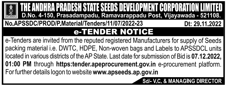 e-Tenders are invited from the reputed registered Manufacturers for supply of Seeds packing material i.e. DWTC, HDPE, Non-woven bags and Labels to APSSDCL units