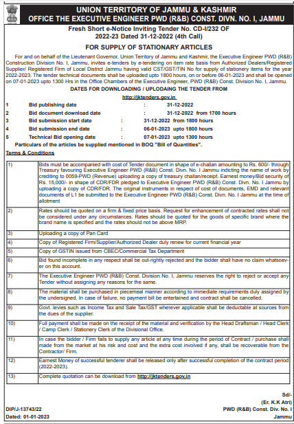 For and on behalf of the Lieutenant Governor, Union Territory of Jammu and Kashmir, the Executive Engineer PWD (R&B)