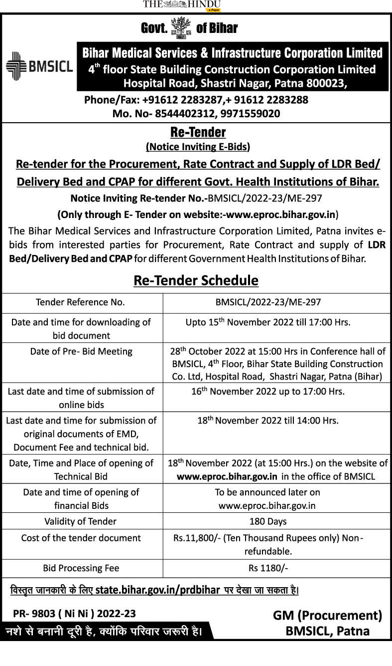 Tender for for the Procurement, Rate Contract and Supply of LDR Bed/ Delivery Bed and CPAP for different Govt. Health Institutions of Bihar.