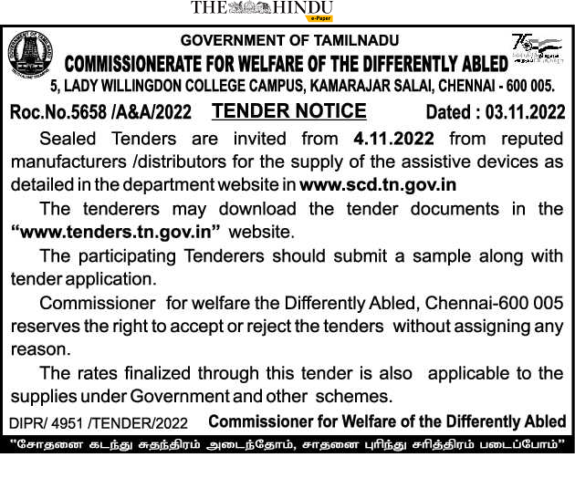 Tenders are invited from 4.11.2022 from reputed manufacturers /distributors for the supply of the assistive devices as detailed in the department website in www.scd.tn.gov.in