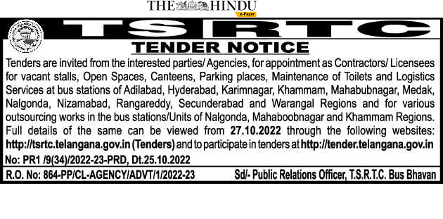 Tenders are invited from the interested parties/Agencies, for appointment as Contractors/Licensees for vacant stalls, Open Spaces, Canteens, Parking places, Maintenance of Toilets and Logistics Services at bus stations of Adilabad, Hyderabad, Karimnagar, Khammam, Mahabubnagar, Medak, Nalgonda, Nizamabad, Rangareddy, Secunderabad and Warangal Regions and for various outsourcing works in the bus stations/Units of Nalgonda, Mahaboobnagar and Khammam Regions.