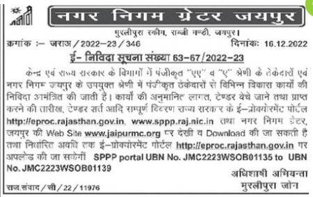 Tender for for various development works are invited from the registered AA and A category contractors in Central and State Government departments and contractors registered in the appropriate category of Municipal Corporation Jaipur