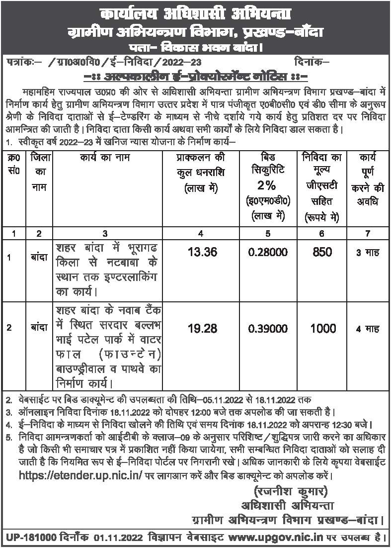 Tender for From Bhuragarh Fort in the city of Banda to Natbaba. Interlocking work up to the place.