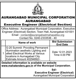 Tender for G-20 Summit- Providing Permanent Illumination aesthetic Lighting and 1 allied Electrical Works at Various locations in Aurnagabad City.