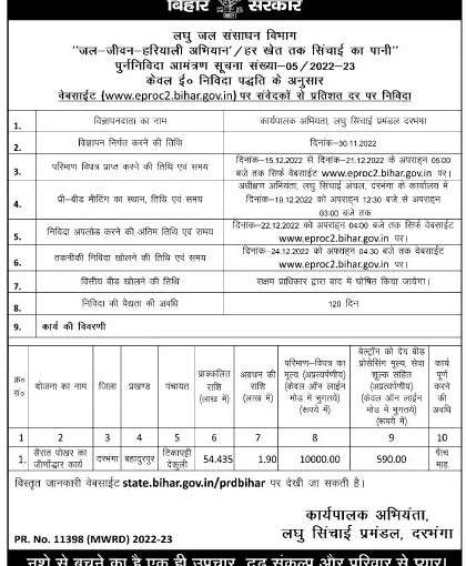 Tender for Government of Bihar Minor Water Resources Department Executive Engineer, Small Irrigation Division, Darbhanga