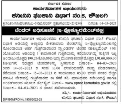 Executive Engineer Kaninini Ghatani Section No.5 Short Term Percentage Tender under Kaujalgi Department in e-portament | Standard Tender Document 4701 by Registered Eligible Contractor under Scheme | A contract has been called for the work and the estimated contract amount is 190.26 crores and the advance deposit amount is 1,91,00,000.00 crores. Date of receipt of tenders:- 04-03-2023 | to 14-03-2023 upto 16.00 hrs and date of opening of tenders:- 15-03-2023 after 500 hrs in the evening For further information the contractor may contact the office of the undersigned and through internet at the website address