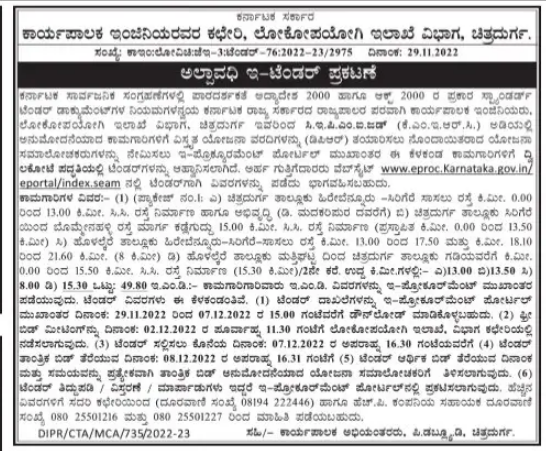 Tender for Government of Karnataka Office of the Executive Engineer, Public Works Department Division, Chitradurga.