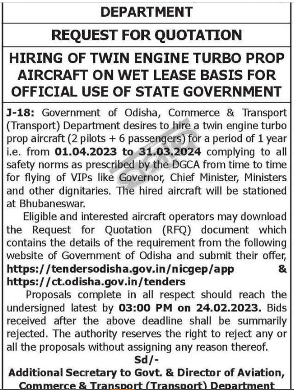 Tender for Government of Odisha, Commerce & Transport (Transport) Department desires to hire a twin engine turbo prop aircraft (2 pilots + 6 passengers) for a period of 1 year i.e.