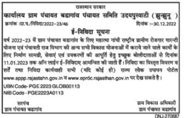 Tender for Government of Rajasthan Office of Gram Panchayat Badagaon Panchayat Samiti Udaipurwati (Jhunjhunu) Number G.P./Tender/2022-23/46 for the supply of construction materials, services and equipments