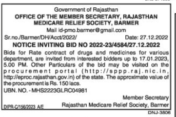 Tender for Government of Rajasthan OFFICE OF THE MEMBER SECRETARY, RAJASTHAN MEDICARE RELIEF SOCIETY contract of drugs and medicines for various department, are invited from interested bidders