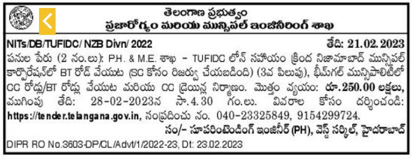 Name of Works (2 Vols.): PH. & M.E. Department – Laying of BT Road in Nizamabad Municipal Corporation (Reserved for SC) (3rd Call), Laying of CC Roads/BT Roads and Construction of CC Drains in Bhimgal Municipality under TUFIDC Loan Assistance. Total Cost: Rs. 250.00 Lakhs, Closing Date: 28-02-2023 at 4.30 PM.