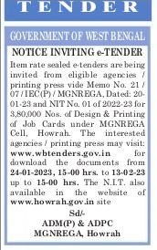Tender for GOVERNMENT OF WEST BENGAL Design & Printing of Job Cards under MGNREGA Cell, Howrah