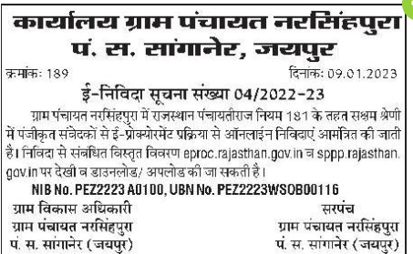Tender for Gram Panchayat Narsinghpura, under Rajasthan Panchayatiraj Rule 181, online tenders are invited from the registered contractors in the competent category
