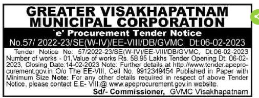 Tender for GREATER VISAKHAPATNAM MUNICIPAL CORPORATION ‘e’ Procurement Tender Notice