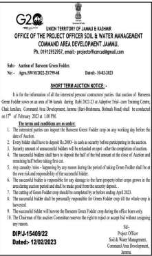 Tender for Green Folder sown on an area of 06 kanals daring Rabi 2022-23 at Adaptive Trial-cam Training Centre Chak Janillan, Command Area Development, Jammu (Bari-Brahmana, Hishnah Road) shall be conducted