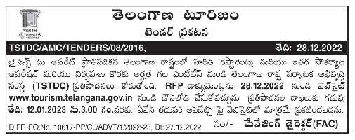 Tender for Green restaurants and other facilities in Telangana state on license to operate basis Telangana State Tourism Development Corporati