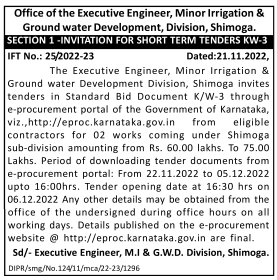 Tender for Ground water Development Division, Shimoga invites tenders in Standard Bid Document K/W-3 through e-procurement portal of the Government of Karnataka, viz.,http://eproc.karnataka.gov.in from eligible contractors for 02 works coming under Shimoga