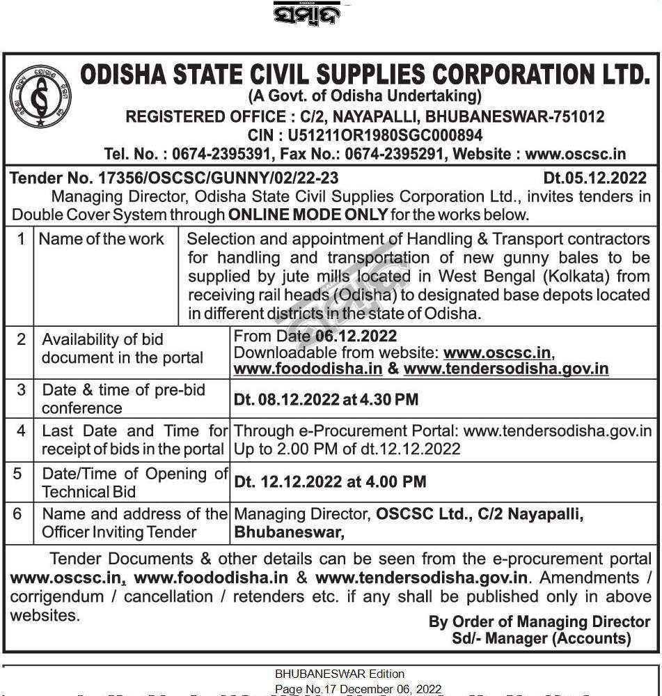 Selection and appointment of Handling & Transport contractors for handling and transportation of new gunny bales to be supplied by jute mills located in West Bengal (Kolkata) from receiving rail heads (Odisha) to designated base depots located in different districts in the state of Odisha.
