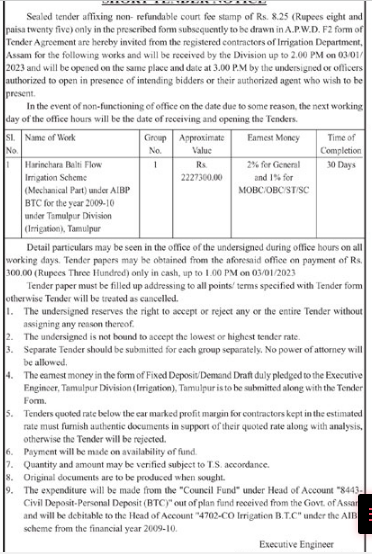 Tender for Harinchara Balti Flow Irrigation Scheme (Mechanical Part) under AIBP BTC for the year 2009-10 under Tamalpur Division (Irrigation), Tamulpur Detail particulars may