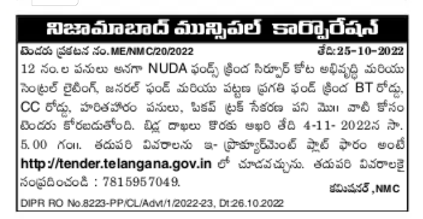 Tender for Haritaharam works under general fund and urban progress fund, pick up truck procurement work etc.