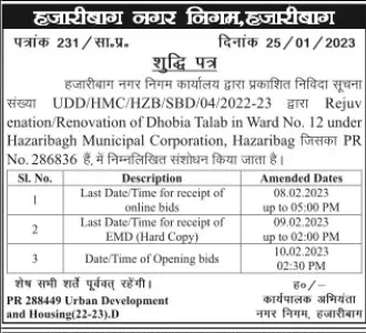 Tender for Hazaribagh Municipal Corporation Office Rejuv enation/Renovation of Dhobia Talab in Ward No. by number UDD / HMC/HZB/SBD/04/2022-23. 12 under Hazaribagh Municipal Corporation, Hazaribagh for PR No. 286836