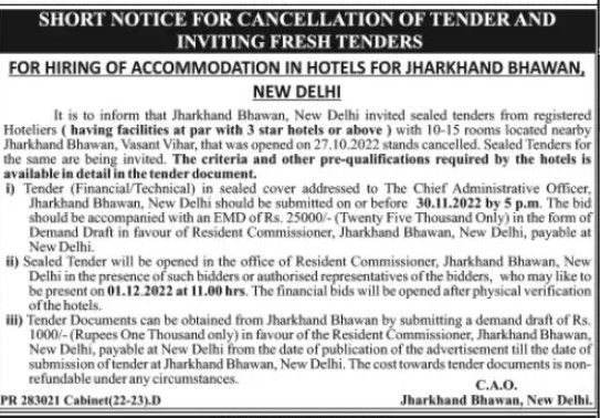 Jharkhand Bhawan, Vasant Vihar, that was opened on 27.10.2022 stands cancelled. Sealed Tenders for