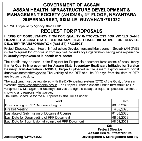 Tender for HIRING OF CONSULTANCY FIRM FOR QUALITY IMPROVEMENT FOR WORLD BANK FINANCED ASSAM STATE SECONDARY HEALTHCARE INITIATIVE FOR SERVICE DELIVERY TRANSFORMATION (ASSIST) PROJECT