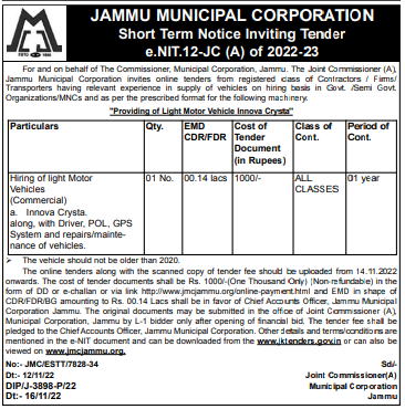 Tender for Hiring of light Motor Vehicles Innova Crysta. along, with Driver, POL, GPS System and repairs/maintenance of vehicles.