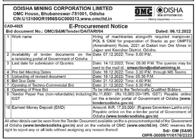 Hiring of machineries alongwith required manpower, POL & O&M for preparation of Stacks as per OMPTS (Amendment) Rules, 2021 at Daitari Iron Ore Mines in Jajpur and Keonjhar District, Odisha.