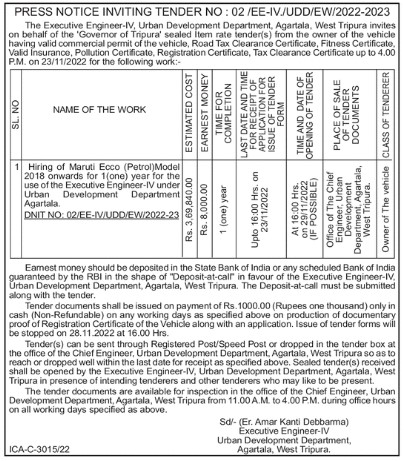 Tender for Hiring of Maruti Ecco (Petrol) Model 2018 onwards for 1(one) year for the use of the Executive Engineer-IV under Urban Development Department Agartala DNIT NO: 02/EE-IV/UDD/EW/2022-23